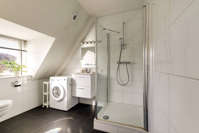 De badkamer (2021) is netjes afgewerkt en beschikt over een inloopdouche, wastafelmeubel, toilet en aansluiting voor de wasmachine.