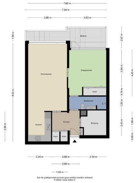 The bedroom is located at the rear and features a built-in wardrobe; a quiet