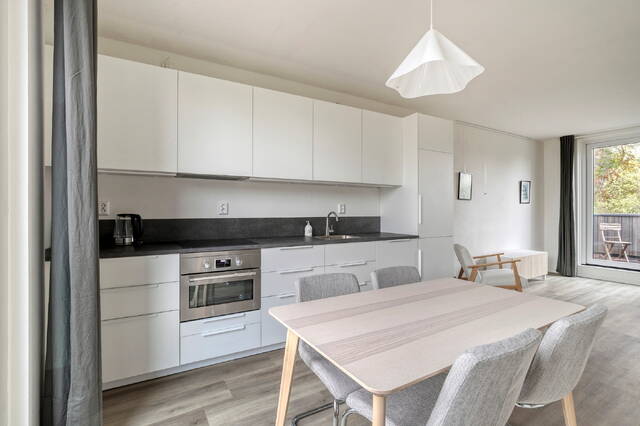 First floor: Bright living room with a brand-new open kitchen. The kitchen is equipped with an induction hob, extractor hood, combi-oven, refrigerator, freezer, and dishwasher. From the living room, you have access to a spacious roof terrace facing northeast.