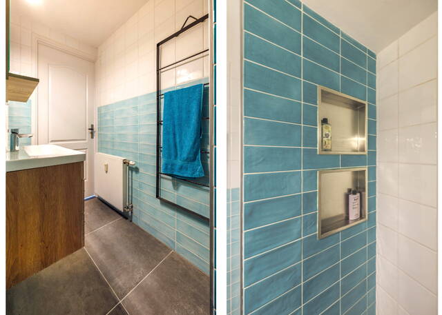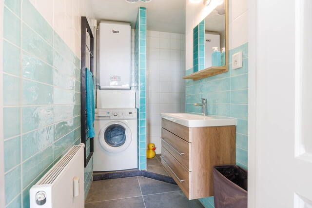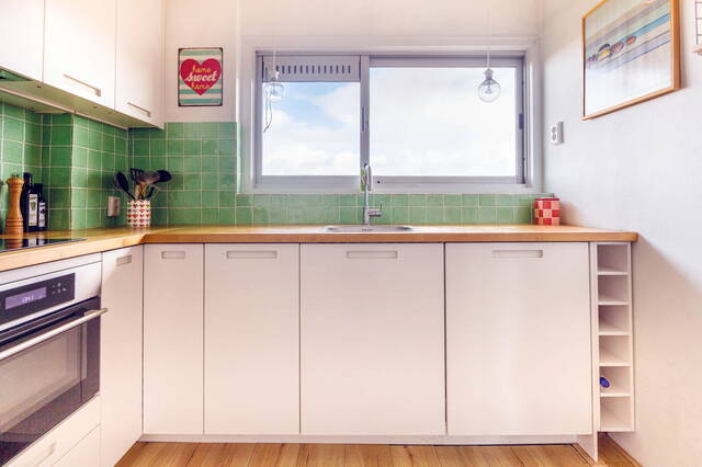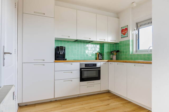 De lichte, moderne keuken is uitgerust met een houten werkblad, charmante groene wandtegeltjes en diverse inbouwapparatuur, waaronder een vaatwasser, combimagnetron/-oven inductiekookplaat, koel-/vriescombinatie en een ingebouwde afzuigkap. Vanuit de keuken is de fraai betegelde badkamer bereikbaar, voorzien van een wastafelmeubel, inloopdouche en de opstelling voor de wasmachine.