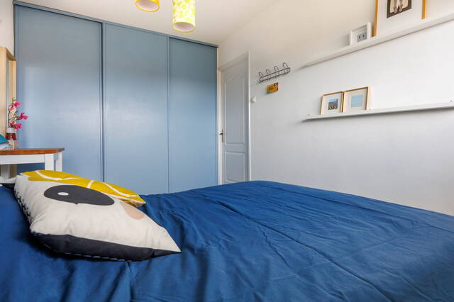 From the hall, you can access the modern toilet, the utility cupboard (meter cupboard), and the large bedroom. This bedroom features a spacious built-in wardrobe with sliding doors. Here too, the view is impressive, overlooking the water and a large part of the city.