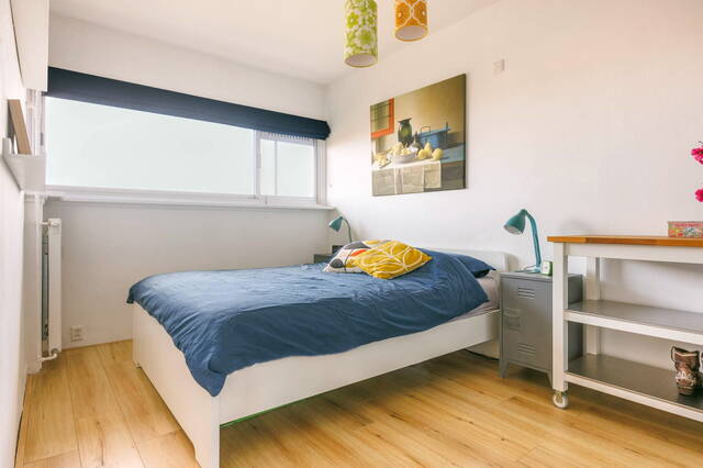 Vanuit de hal bereik je het moderne toilet, de meterkast en de grote slaapkamer. Deze beschikt over een ruime vaste kledingkast met schuifdeuren. Ook hier is het uitzicht fraai, over het water en een groot deel van de stad.