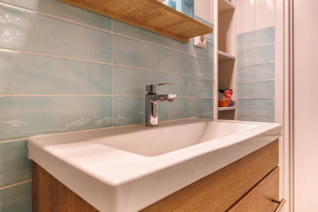 The bright, modern kitchen is equipped with a wooden countertop, charming green wall tiles, and various built-in appliances, including a dishwasher, combination microwave/oven, induction hob, fridge-freezer, and built-in extractor hood. From the kitchen, you can access the beautifully tiled bathroom, which includes a vanity unit, walk-in shower, and space for a washing machine.