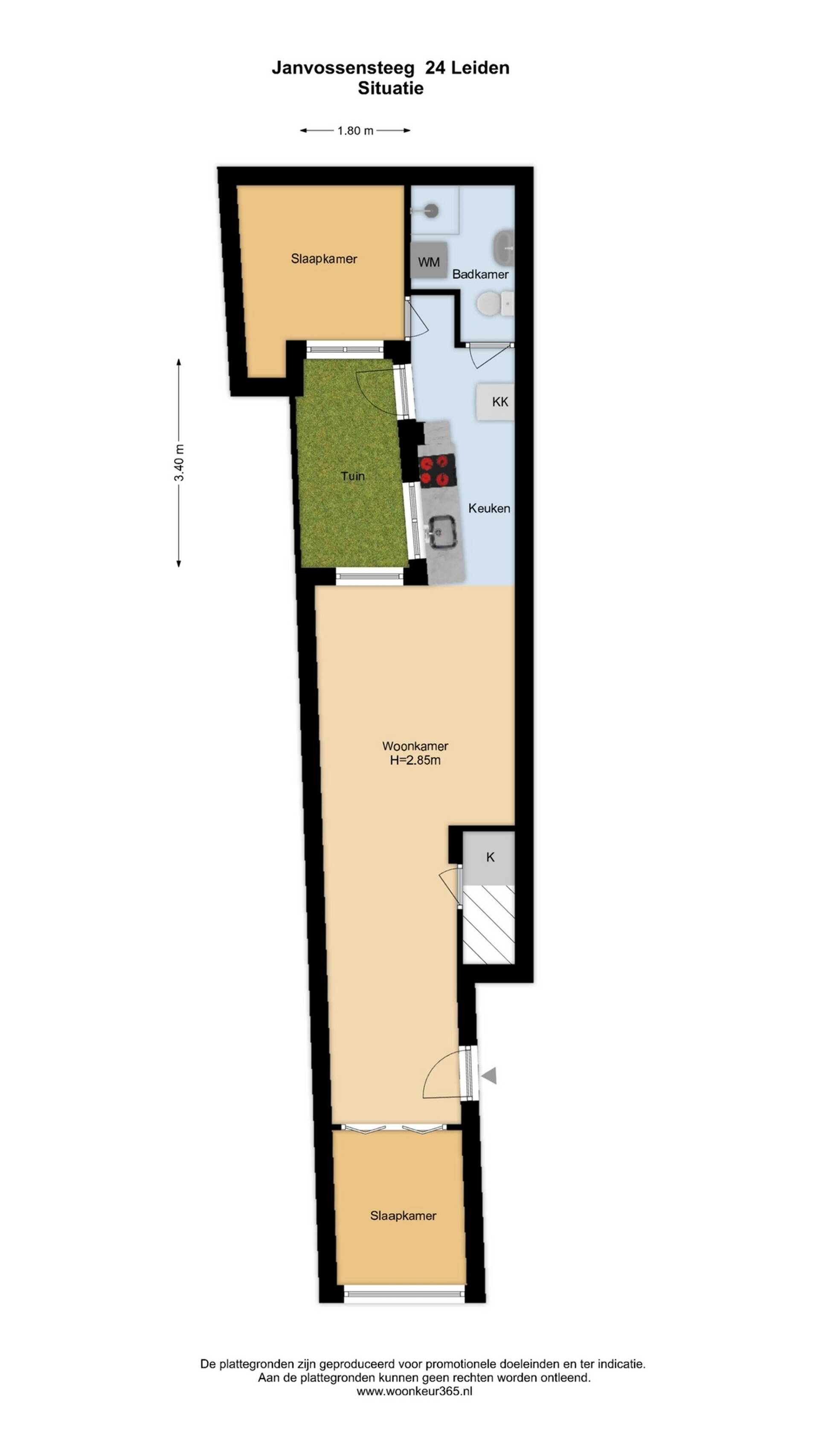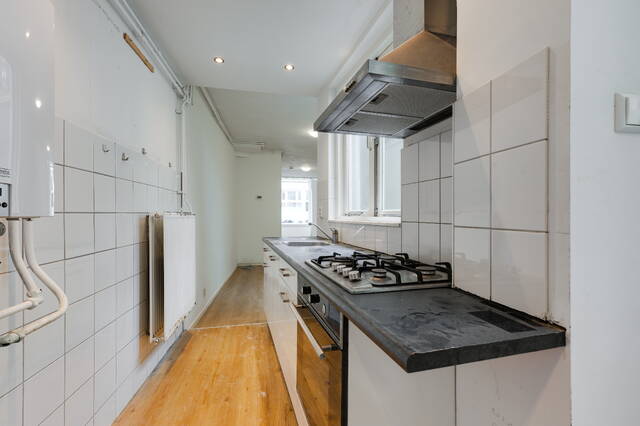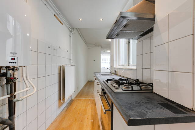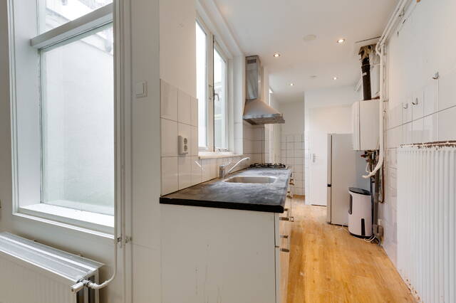 Aan de achterzijde bevindt zich de keuken, voorzien van een gaskookplaat, afzuigkap en spoelbak. Vanuit hier heb je toegang tot de patio/tuin – een fijne plek om even buiten te zitten midden in de stad.