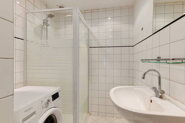 At the rear, you will find the kitchen, equipped with a gas stove, extractor hood and sink. From here you have access to the patio/garden – a lovely spot to enjoy some outdoor space in the middle of the city.
