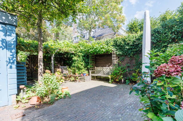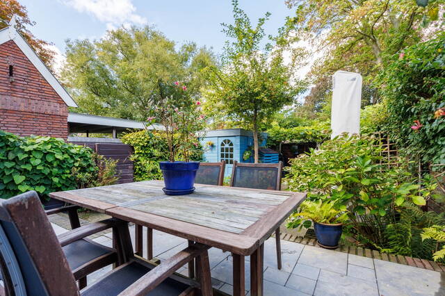 Zowel middels de openslaande deuren vanuit de eetkamer als vanuit de keuken bereikt u de groene en zonnige achtertuin met een fraai terras en een lager gelegen gedeelte met meerdere mogelijkheden voor zitjes in een pergola en een prieeltje. Er is fraaie beplanting met veel groen, waaronder een sierappelboom en achterin een pergola begroeid met druivenranken en blauwe regen, waar u tijdens warme dagen heerlijk beschut kunt zitten. In de tuin bevinden zich tevens twee regentonnen. Naast de achtertuin heeft de woning ook een zonnige voortuin en een zijpad met toegang naar de achtertuin. Het grindpad zorgt voor veiligheid aan de zij- en achterkant van het huis.