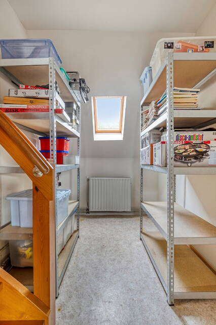 Via een vaste trap te bereiken ruime zolderverdieping met de originele balkenconstructie, een groot veluxraam (aan de achterzijde), opstelling wasmachine/droger en veel bergruimte. Hier zou desgewenst nog een slaapkamer gecreëerd kunnen worden.
