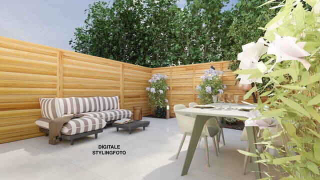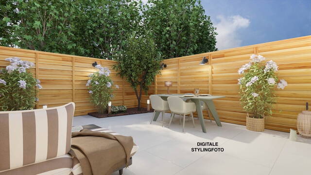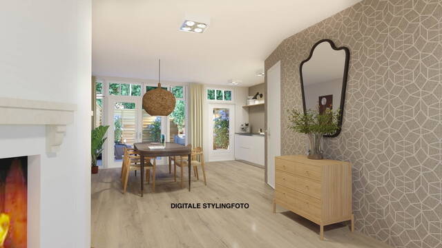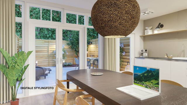 In de presentatie zijn ook digitale stylingfoto's(artist impressions) opgenomen van een woonkamer met een open keuken en de tuin zonder de berging.