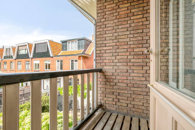 Landing with toilet and stairs to the second floor. Spacious front bedroom with bay window (with stained glass). Additional smaller (bed)room at the front. Large rear bedroom with access to a covered balcony. Also on this floor: bathroom with washbasin unit, shower, and designer radiator.