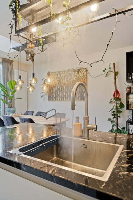 De moderne uitgebouwde open keuken met kookeiland is een droom voor elke thuiskok: veel kast- en bergruimte, een moderne grote inductiekookplaat, vaatwasser, Amerikaanse koelkast, ruime wijnkoelkast, stoomoven, Quooker én directe toegang tot de tuin met vrijstaande houten berging en achterom.