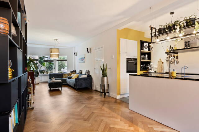 Bij binnenkomst tref je een ruime hal met een moderne meterkast en een modern toilet met mechanische afzuiging. De royale woonkamer heeft strak gestucte wanden en is heerlijk licht dankzij de grote ramen. De visgraatparketvloer geeft het geheel een luxe uitstraling. Op mooie dagen maak je van de woonkamer, keuken en de zonnige achtertuin één groot leefgebied dankzij de brede harmonicadeuren, die bijna de gehele achtergevel openen. Zo geniet je optimaal van binnen én buiten!