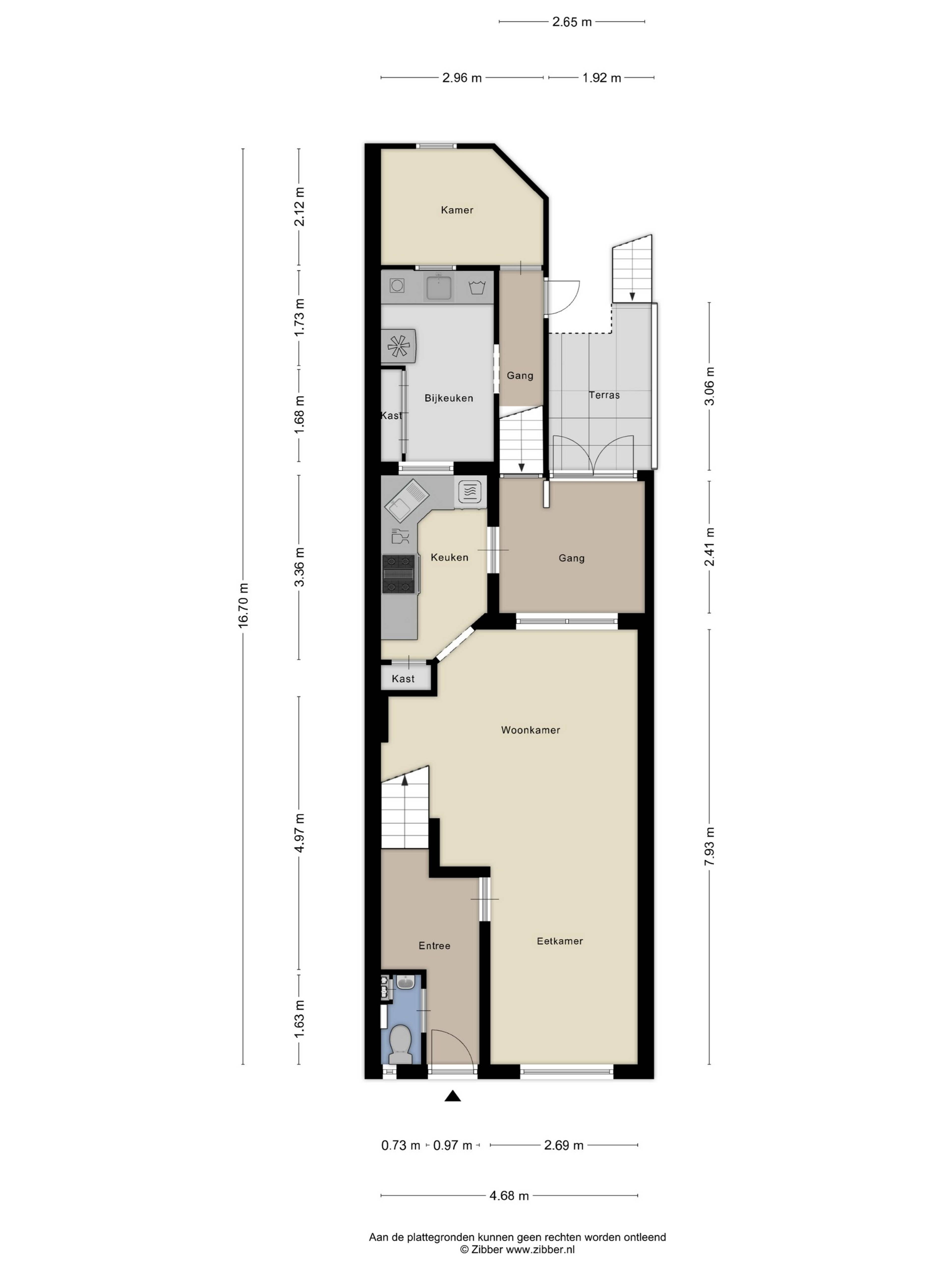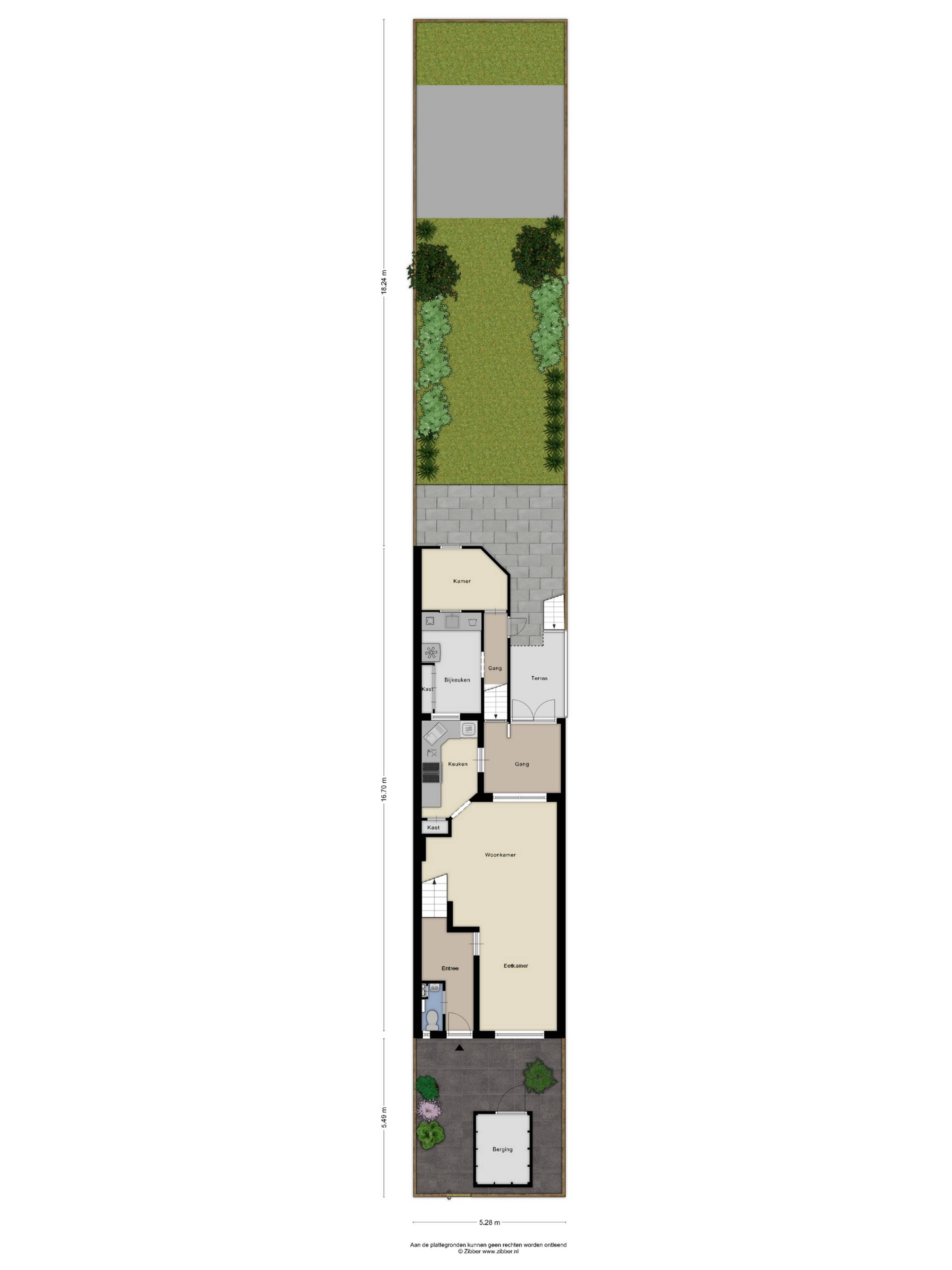 Disclaimer: De werkkamer grenzend aan de tuin is in de opgegeven woonoppervlakte meegerekend. Door de plafondhoogte van 1,96 meter voldoet deze ruimte echter formeel niet aan de eisen voor woonoppervlakte conform de NEN 2580-norm.