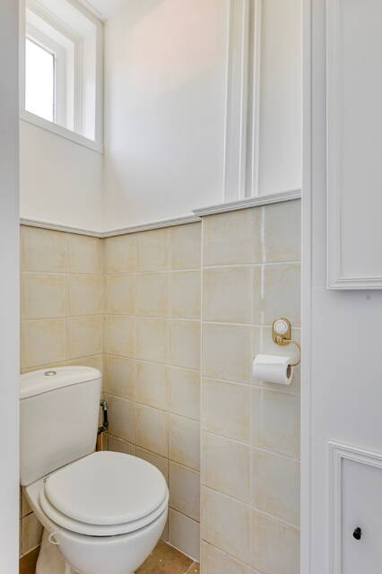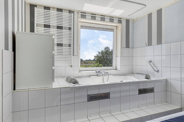 The first floor has three bedrooms. The largest bedroom is at the rear and has a built-in wardrobe, space for a double bed, and even a jacuzzi with stunning views over the meadows. The landing, with a large built-in closet, provides access to the bathroom, the second spacious bedroom, and the third, smaller bedroom. The bathroom is equipped with a washbasin, toilet, and shower.