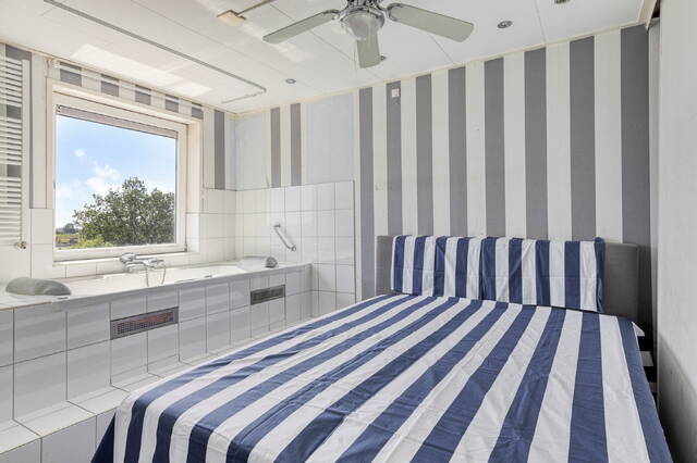 De eerste verdieping beschikt over drie slaapkamers. De grootste slaapkamer ligt aan de achterzijde en heeft een inbouwkast, ruimte voor een tweepersoonsbed en een jacuzzi met prachtig uitzicht over de polder. De overloop, met een ruime inbouwkast, biedt toegang tot de badkamer, de tweede ruime slaapkamer en de derde, kleinere slaapkamer. De badkamer is voorzien van een wastafel, toilet en douche.