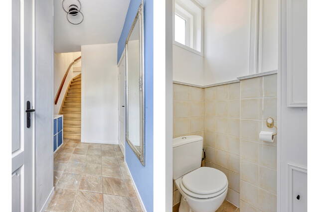 Entrance with access to the toilet, the staircase to the first floor, and the door to the living room. The toilet has a small sink, and the meter cupboard is also located here. Thanks to large windows on both sides, the living room is wonderfully bright. At the front, you’ll find the dining area with enough space for a large dining table. There is also a spacious sitting area with room for a generous sofa. From the living room, you have access to the semi-open kitchen. Adjacent to this is a small sunroom, and the stairs down lead to the utility room and the study.