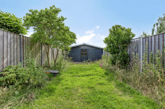 De voortuin is royaal en heeft een schuur voor de fietsen. De circa 21 meter diepe achtertuin ligt op het zuiden en beschikt over een ruime schuur van circa 5 bij 5 meter.
