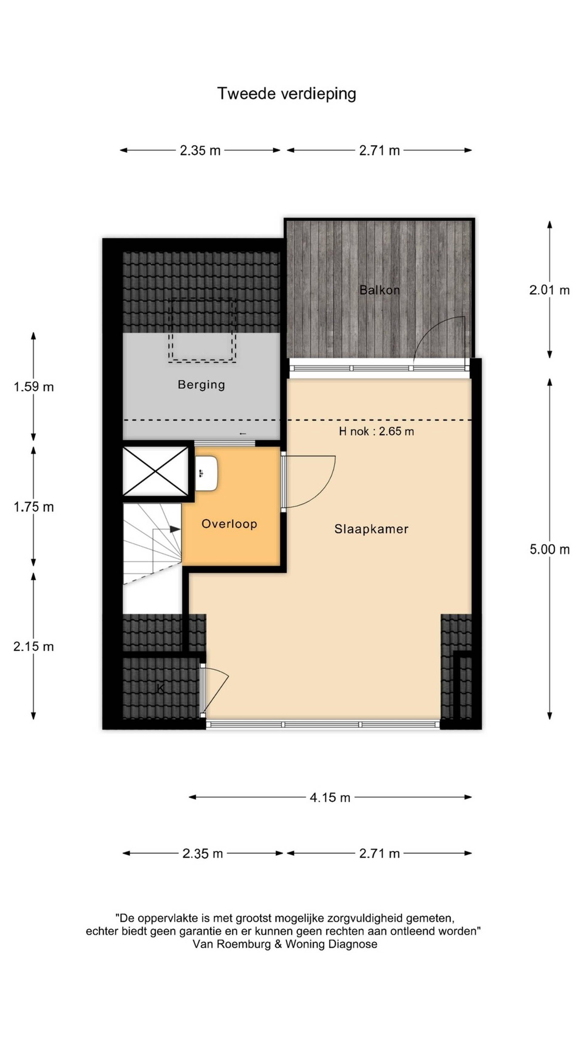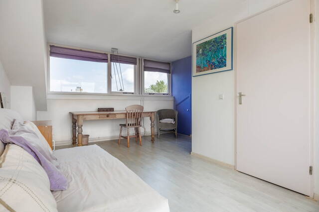 Royale overloop met wastafel en een extra berging aan de achterzijde met een Velux dakraam en opstelling CV-ketel en zonnecollector. De gezellige en lichte slaapkamer heeft een vaste kast aan de voorzijde en grenst aan de achterzijde aan het balkon met prachtig uitzicht op de Zijl.