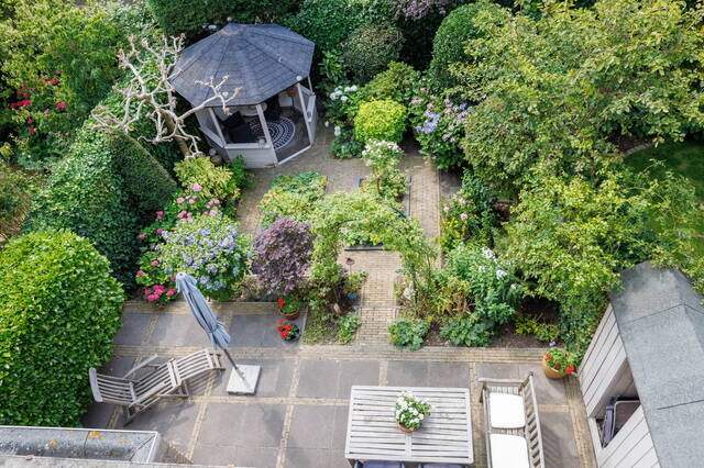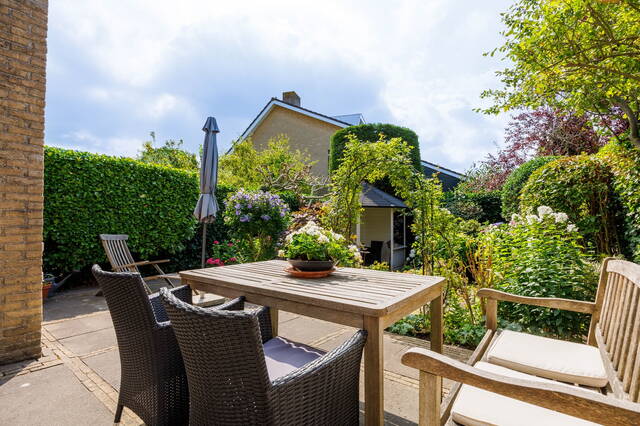 Via the beautifully landscaped front garden, you enter the hallway, which includes a coat area and a toilet with a small sink. From the hallway, you step into the spacious and bright L-shaped living room with a cozy open fireplace and an open-plan kitchen. The room has large windows, letting in plenty of natural light, and a charming side area that also overlooks the garden. Through the sliding doors, you access the generously sized and beautifully landscaped south-facing backyard, where you can enjoy the sun all day long. There is a cozy gazebo, a sunshade, and built-in storage cabinets for extra space.