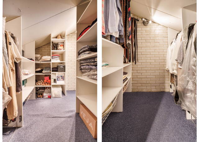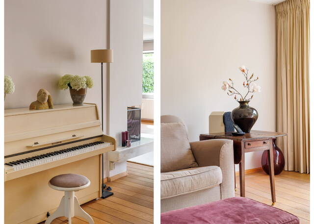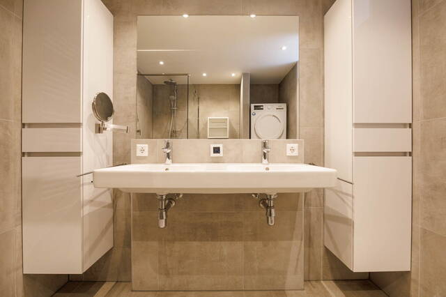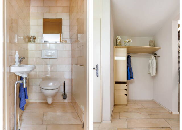 A spacious landing with plenty of daylight thanks to a side window. At the front of the house is a large bedroom with air conditioning and a walk-in closet. At the rear are two spacious and bright rooms that can be used as bedrooms or home offices; one of them also features a washbasin. The modern and luxurious bathroom (2021) is spacious and includes a rain shower, toilet, towel radiator, and double sink vanity with mirror, two floating cabinets, built-in lighting, and mechanical ventilation. The bathroom also houses the washing machine and dryer.