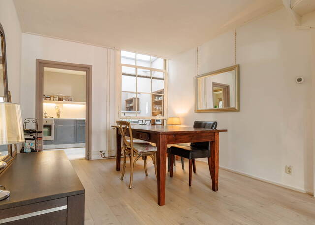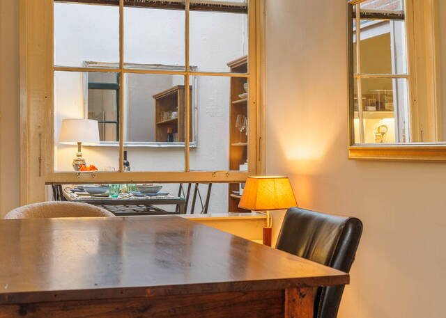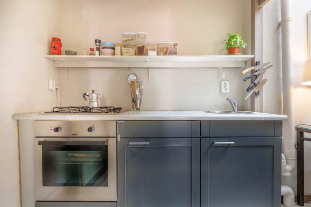 Entrance with direct access to the charming living room, which flows into the cozy kitchen-diner, situated where the courtyard used to be. Thanks to the high windows that remain between the kitchen and living room, this is now a lovely sitting area with lots of daylight. The charming kitchen includes a 4-burner gas stove, a built-in oven, and a (freestanding) microwave.