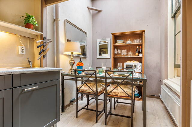 Entree met direct toegang tot de fraaie woonkamer met aansluitend de gezellige keuken met een eetgedeelte waar voorheen de binnenplaats was. Door o.a. nog de aanwezige hoge ramen naar de woonkamer is dit een heel gezellig zitgedeelte met veel daglicht. De knusse keuken beschikt o.a. over een 4-pitsgasfornuis, een inbouwoven en een (losse) magnetron.
