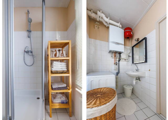 The bright bathroom has a shower, a large window, a sink, and a washing machine connection. The central heating boiler is also located here. Off the landing is a separate toilet with a small sink.