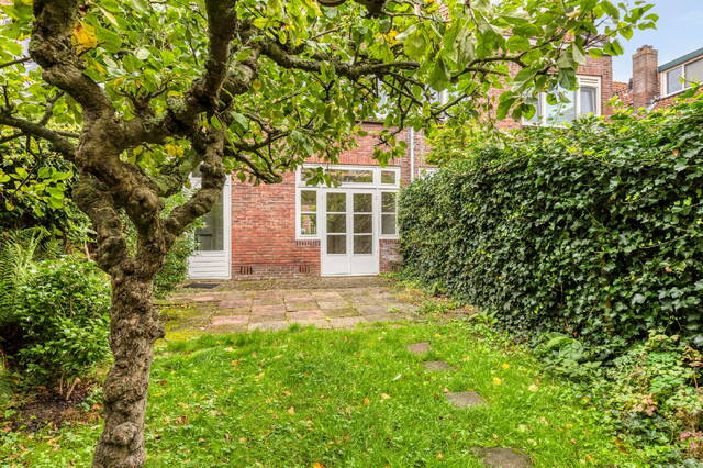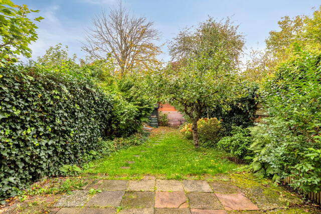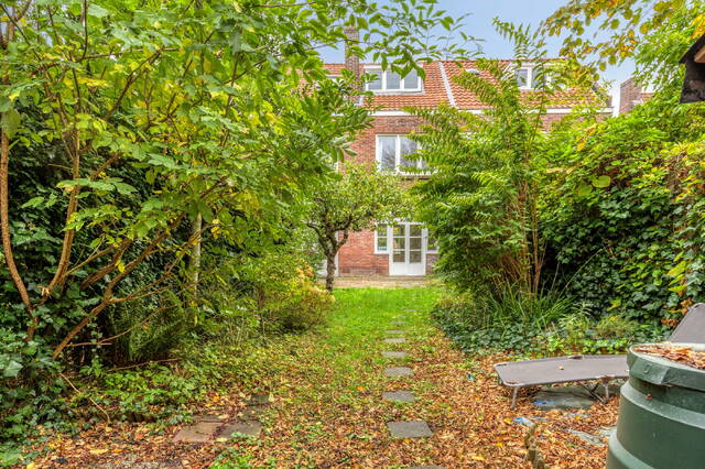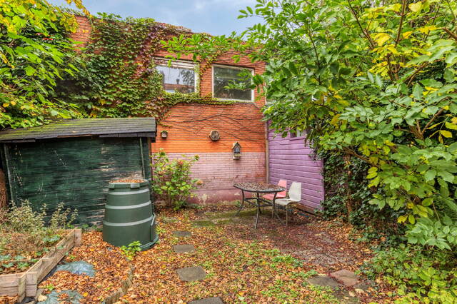 Achter de woning ligt een fijne stadstuin met privacy en een externe berging (3 m²) voor fietsen en tuingereedschap.