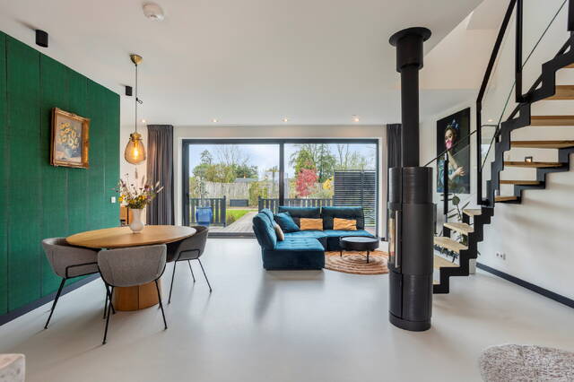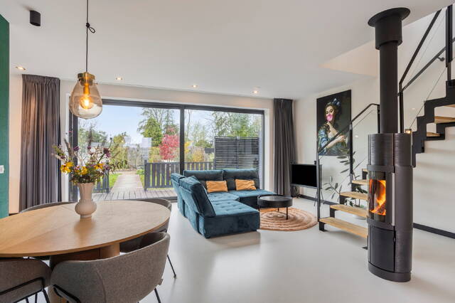 De woonkamer is verrassend ruim en licht, met een grote glazen schuifpui die het binnen- en buitenleven naadloos met elkaar verbindt. De ruimte is speels ingedeeld en biedt een apart gedeelte dat momenteel in gebruik is als kantoor of werkruimte, ideaal voor thuiswerken of als leeshoek. Hier bestaat tevens de mogelijkheid om eenvoudig een derde slaapkamer te creëren. Achterin bevindt zich het tuingerichte zitgedeelte, waar in alle rust van het uitzicht over de tuin, het groen en het water kan worden genoten. Dit gedeelte staat in open verbinding met de rest van de woonkamer en de sfeervolle draaibare houtkachel, die vanuit verschillende hoeken van de kamer te bewonderen is en zorgt voor een warme, uitnodigende sfeer. De stalen trap met frakéhouten treden sluit hier prachtig op aan en vormt een stijlvolle eyecatcher in het interieur.