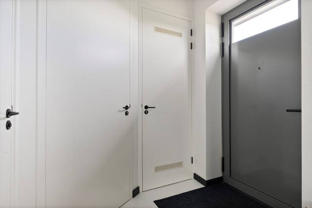 De entree biedt toegang tot een hal met modern toilet en een aparte technische ruimte met de boiler, verdeler voor de vloerverwarming en omvormer voor de zonnepanelen.