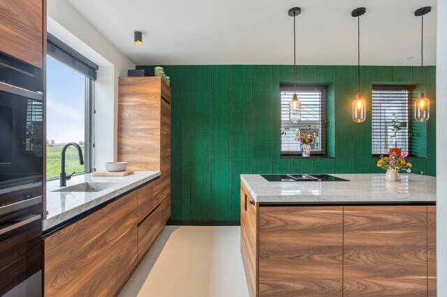Aan de voorzijde bevindt zich de keuken – een echte blikvanger: tijdloos, strak en van hoge kwaliteit. Het royale kookeiland met barzitje vormt het hart van de ruimte, ideaal voor een gezellig ontbijt of een borrel met vrienden. De keuken is voorzien van een inductiekookplaat met geïntegreerde afzuiging, vaatwasser, oven, ingebouwd koffiezetapparaat, koelkast, vriezer en een luxe marmeren werkblad. Dankzij de open verbinding met de eetruimte ontstaat een sfeervol geheel waar koken, eten en wonen perfect samenkomen.