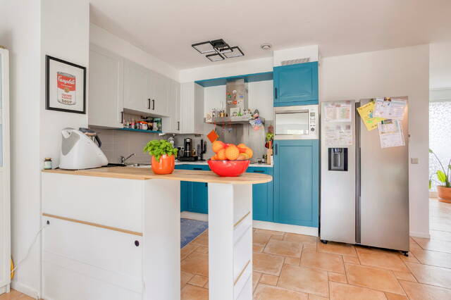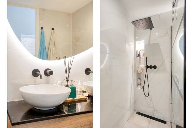 Three bedrooms, including a master bedroom. One of the bedrooms is currently used as a workspace and offers access to the roof terrace. The modern bathroom is fitted with a walk-in shower, double washbasin, bidet, and toilet.
