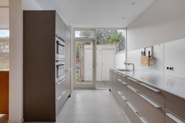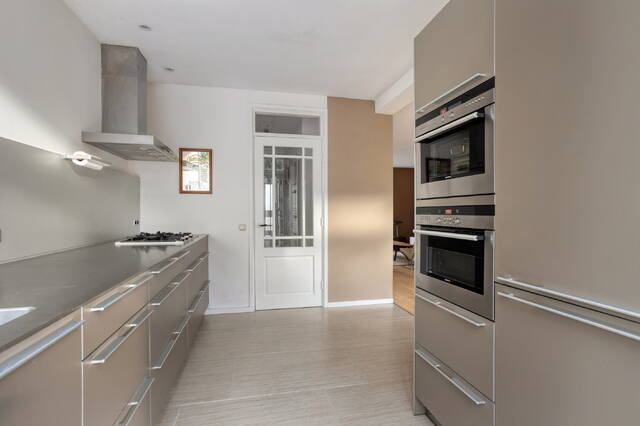 De zeer luxe halfopen Bulthaup-keuken is uitgerust met diverse inbouwapparatuur, waaronder een close-in boiler, 5-pits gasfornuis, vaatwasser, stoomoven, combi-oven/magnetron, grote koel-vriescombinatie en een afzuigkap. Het geheel wordt afgewerkt met een prachtig roestvrijstalen werkblad. Dankzij de grote ramen tot aan de vloer is dit een bijzonder lichte en prettige ruimte.