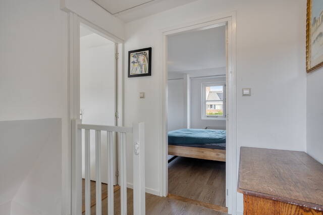 Vanaf de trap bereikt je de overloop, die toegang biedt tot alle kamers op deze verdieping. Aan de achterzijde bevindt zich de ruime hoofdslaapkamer. Dankzij de recht opgetrokken achtergevel is er een opvallend royale ruimte ontstaan, die net dat extra beetje comfort en ruimte biedt. De slaapkamer is voorzien van een praktische inbouwkast en biedt bovendien directe toegang tot het zonnige dakterras.