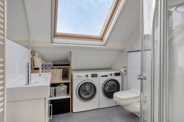 Aan de voorzijde van de woning liggen de tweede slaapkamer en de nette, volledig ingerichte badkamer. De badkamer beschikt over een separate douche, een dubbele wastafel, een tweede toilet (sanibroyeur) en aansluitingen voor de wasmachine en droger. De tweede slaapkamer is licht en knus, dankzij een kleine dakkapel en een Velux dakraam die zorgen voor extra daglicht.