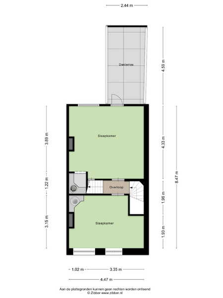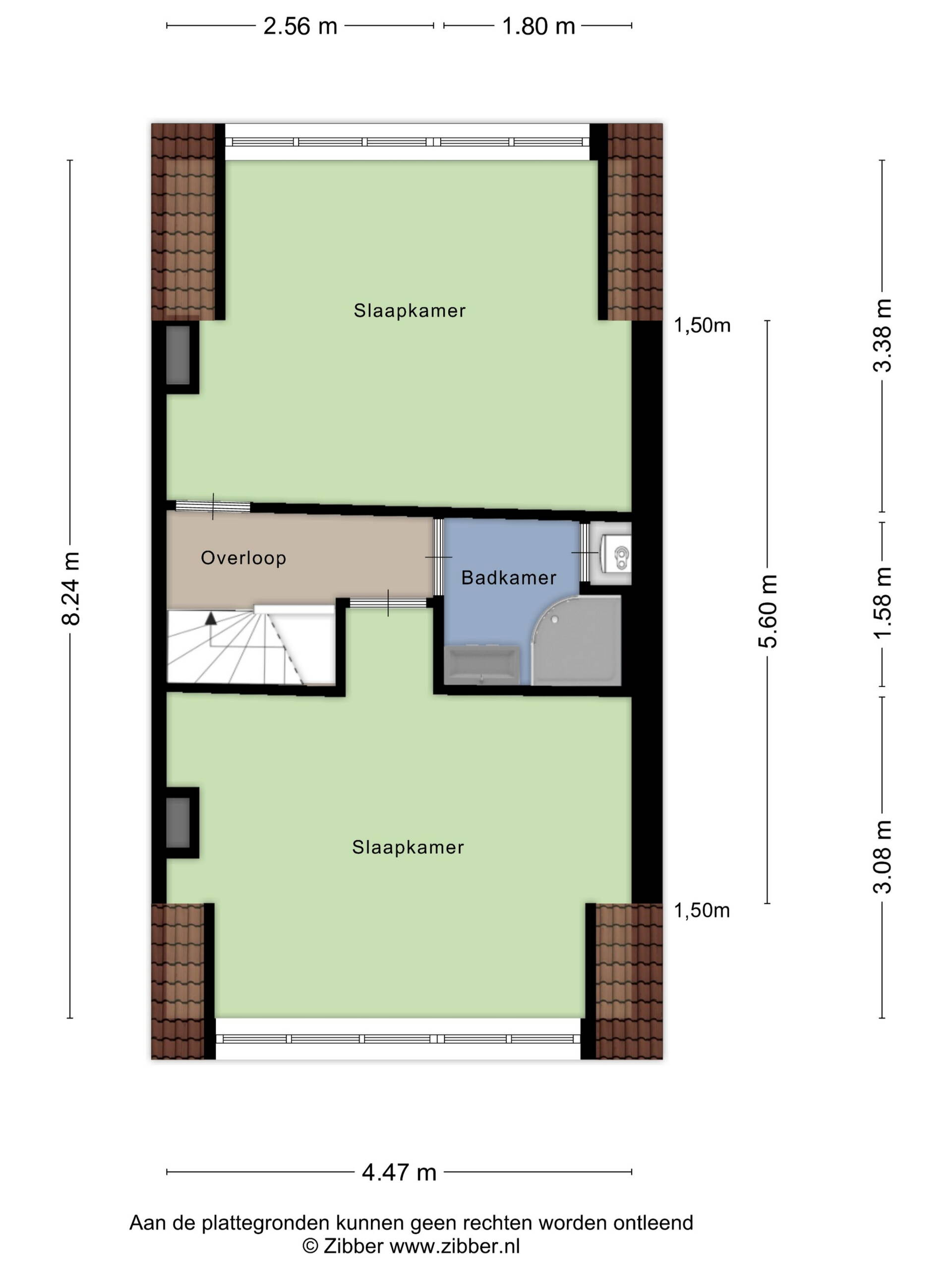 De zolderverdieping bestaat naast de trap en een korte overloop uit twee gezellige lichte kamers van elk ca. 15 m2 en uit een afgesloten ruimte waarin een douche en naast de cv-ketel een wastafelmeubel zijn geplaatst.