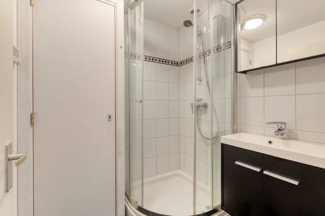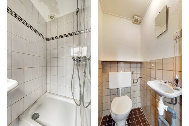 Op de eerste verdieping bevinden zich twee kamers van ca. 13 en 19 m2, beide voorzien van een eigen wastafel. De kamer aan de achterzijde biedt toegang tot het dakterras. Beide kamers beschikken over hoge plafonds en grote ramen, wat zorgt voor veel natuurlijke lichtinval en een natuurlijk gevoel.
