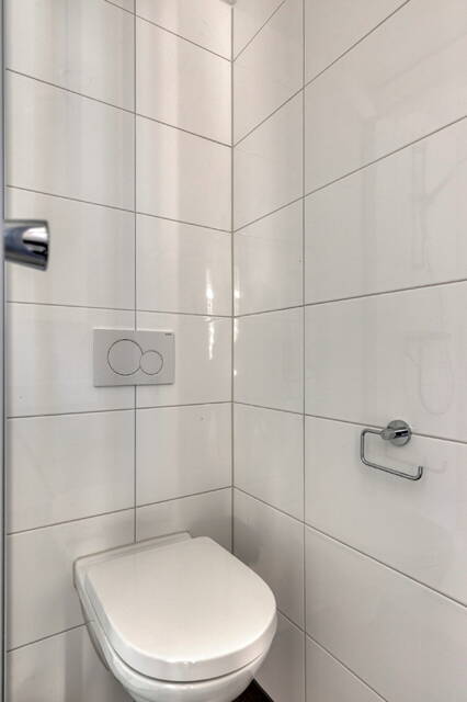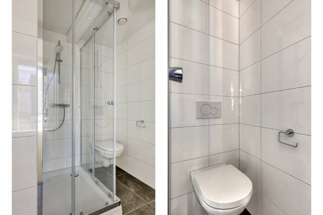 De badkamer is nieuw en uitgerust met een douche, dubbele wastafel met meubel en een handdoekradiator. Beide slaapkamers beschikken bovendien over een eigen fonteintje, ideaal bij gedeeld gebruik.