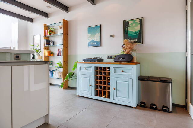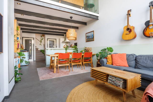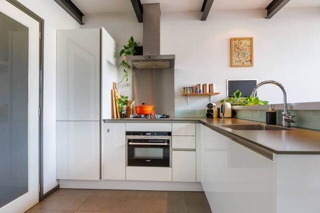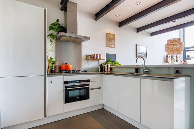Royale woonkamer met een fraaie tegelvloer met vloerverwarming. Moderne open keuken, voorzien van diverse inbouwapparatuur. Opvallend is de hoogte van het plafond (ca. 5 meter) in het voorste gedeelte van de woonkamer. Achterin bevindt zich de trap naar de eerste verdieping en een ruime kast met de opstelling voor de wasmachine en droger. Aan de andere zijde is nog een ruime trapkast.