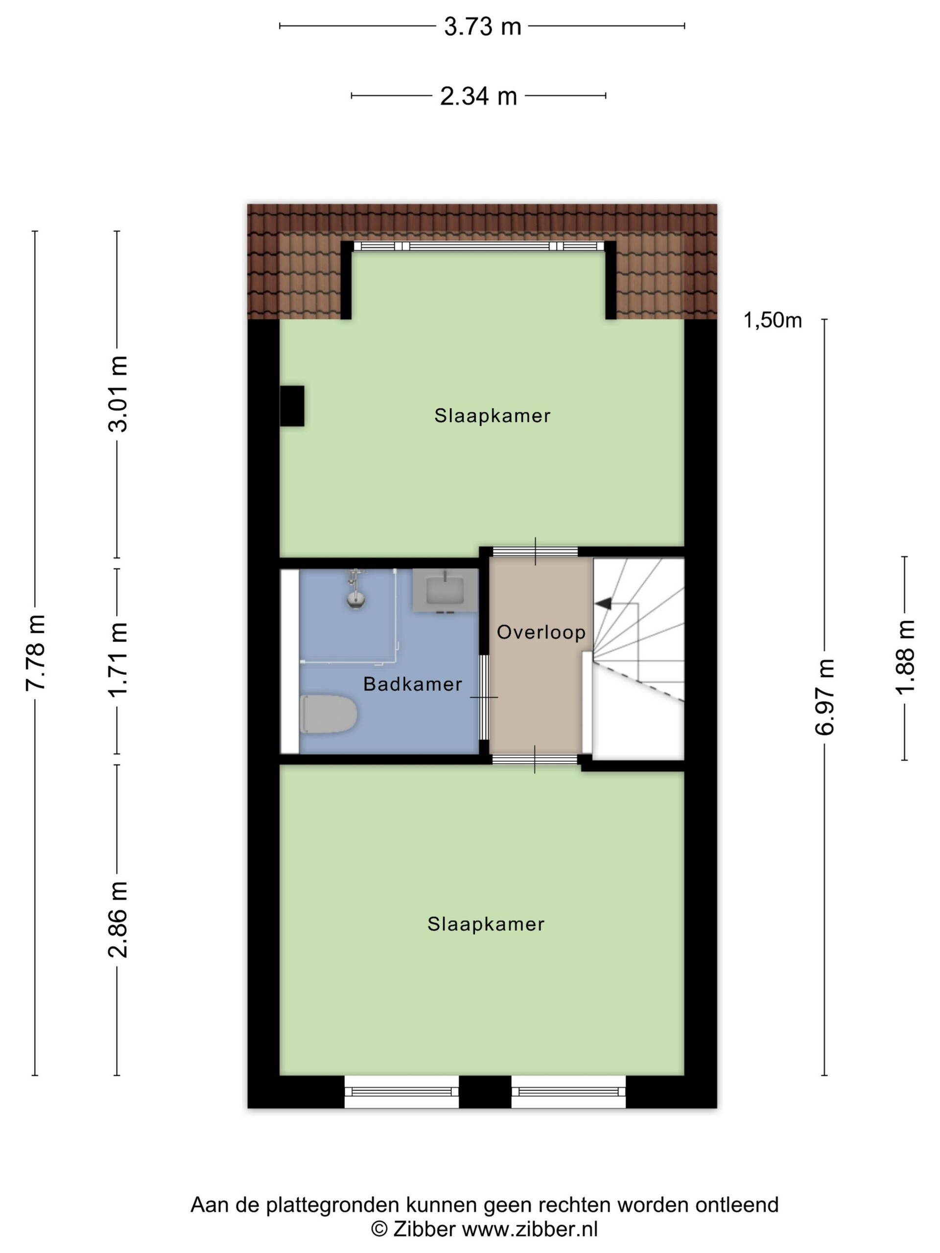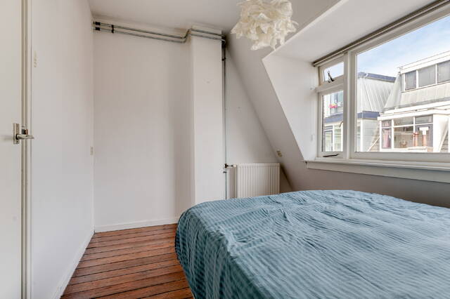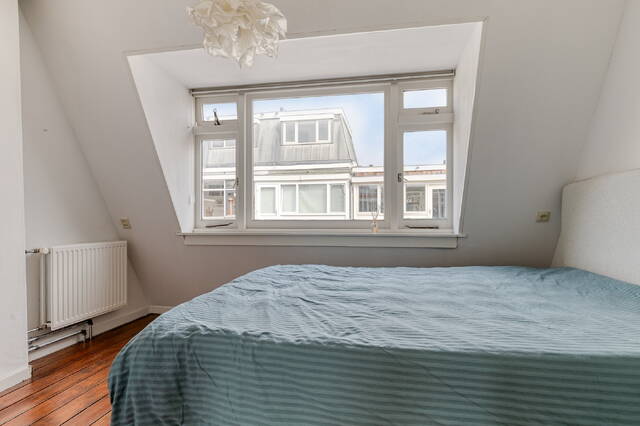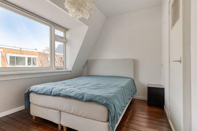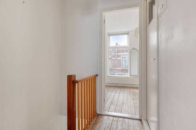 De overloop geeft toegang tot twee slaapkamers en de badkamer. Aan de voorzijde bevindt zich een ruime slaapkamer met grote raampartijen. De tweede slaapkamer ligt aan de achterzijde en is voorzien van een dakkapel. De badkamer, vernieuwd in 2019, ligt tussen de slaapkamers en beschikt over een douche, wastafel en tweede toilet.