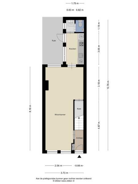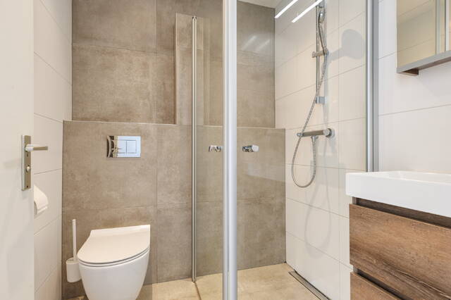 Entree met hal en trapopgang naar de eerste verdieping. De woonkamer is ruim en licht dankzij de grote raampartijen en het hoge plafond, wat zorgt voor een prettig gevoel van ruimte. Een praktische trapkast biedt extra bergruimte. Aan de achterzijde bevindt zich de gesloten keuken, uitgevoerd in een tijdloze stijl en voorzien van diverse inbouwapparatuur. Vanuit de keuken is de patio bereikbaar, een fijne en beschutte buitenruimte. Achter de keuken bevindt zich een hal met de opstelplaats voor de cv-ketel en de aansluitingen voor wasmachine en droger. Hiernaast ligt de toiletruimte.