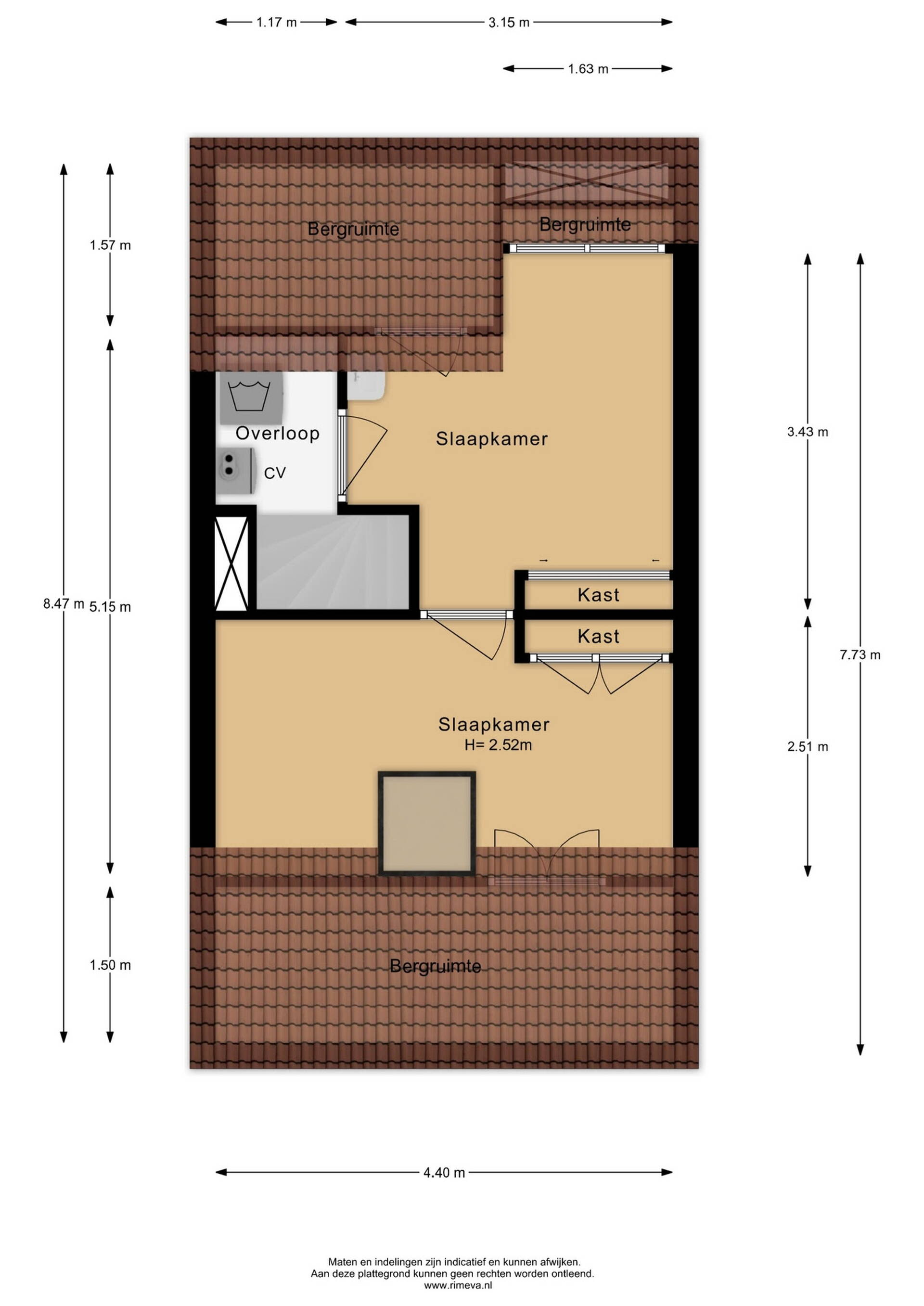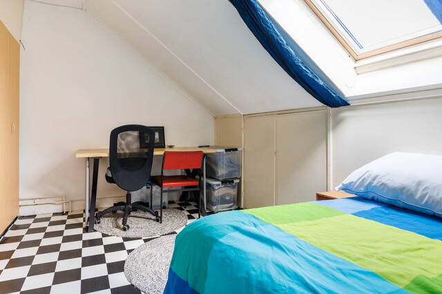 Landing with washing machine setup and central heating boiler, and access to a spacious rear bedroom with a dormer window, built-in (sliding) wardrobe, and ample storage space behind the knee walls. From this bedroom, you can access the front bedroom, which features a skylight, built-in wardrobe, and additional storage behind the knee walls.