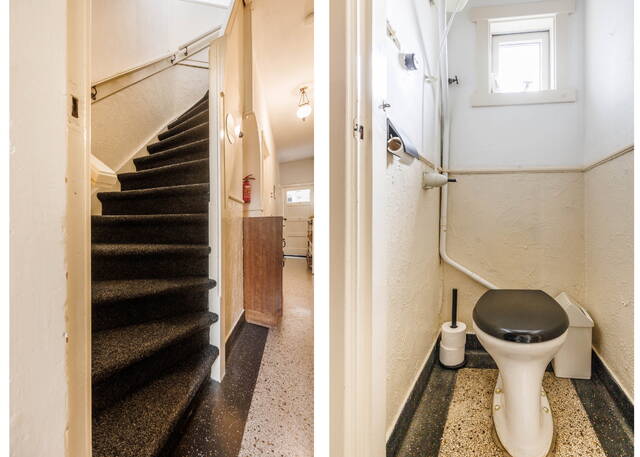 Authentic entrance. Vestibule with meter cupboard and original wall tiles. Followed by a hallway with a staircase to the first floor, featuring an original granito floor and enamel wall paneling. Access to a toilet, also with an authentic granito floor. Adjacent is a simple, enclosed kitchen with a door leading to the pleasant backyard.