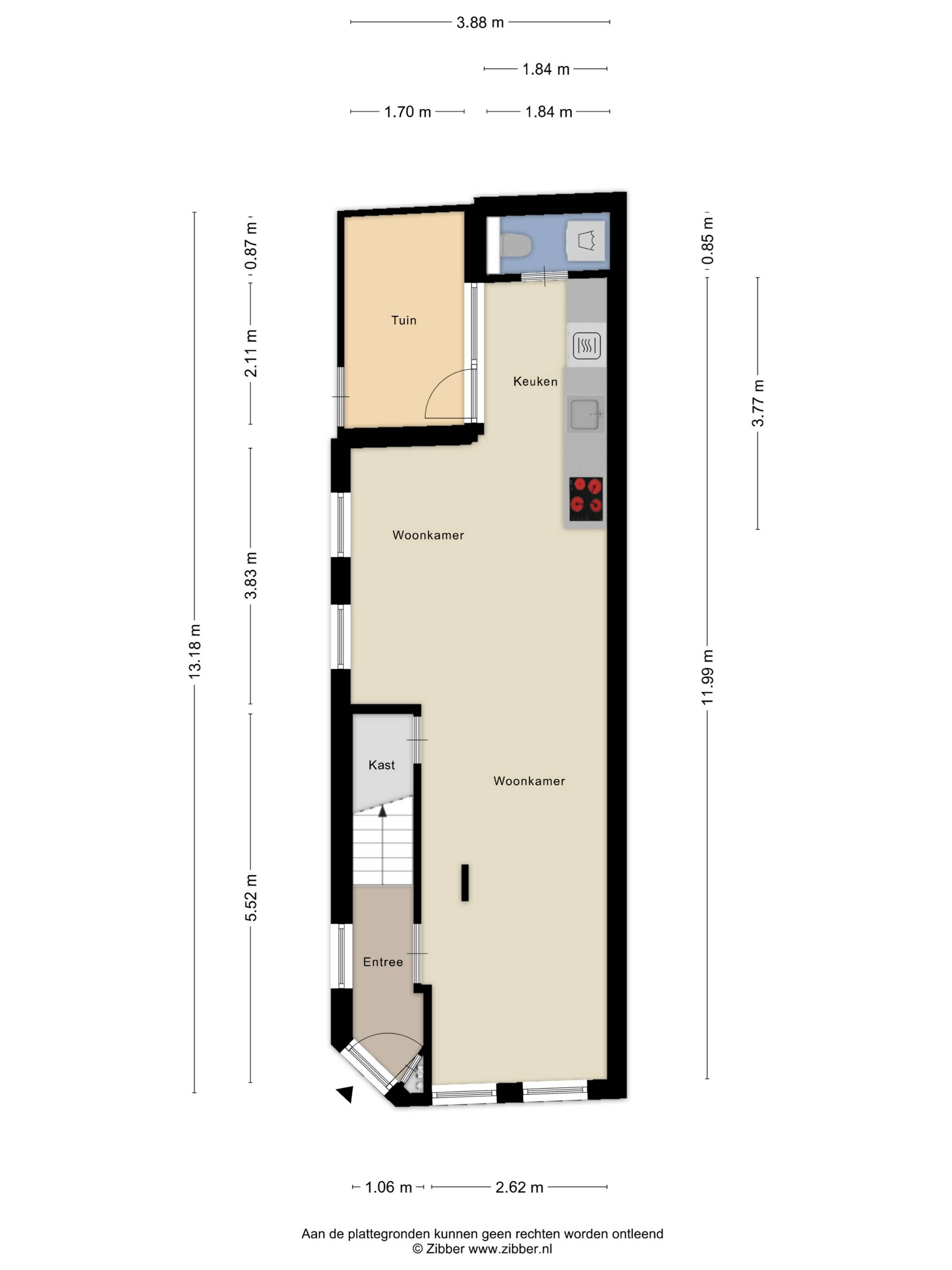 Entree in de hal met meterkast en trapopgang. De doorzonwoonkamer beslaat de volledige lengte van de woning en kenmerkt zich door een prettige lichtinval via de ramen aan voor- en zijkant. De visgraat PVC-vloer met vloerverwarming zorgt voor een comfortabele en moderne basis. Aan de voorzijde is ruimte voor een zitgedeelte, terwijl aan de achterzijde een eethoek in verbinding staat met de keuken. De open keuken is voorzien van moderne inbouwapparatuur en praktische bergruimte. Vanuit hier is de knusse, recent betegelde buitenruimte bereikbaar. Aansluitend bevindt zich het separate toilet met opstelling voor de wasmachine.