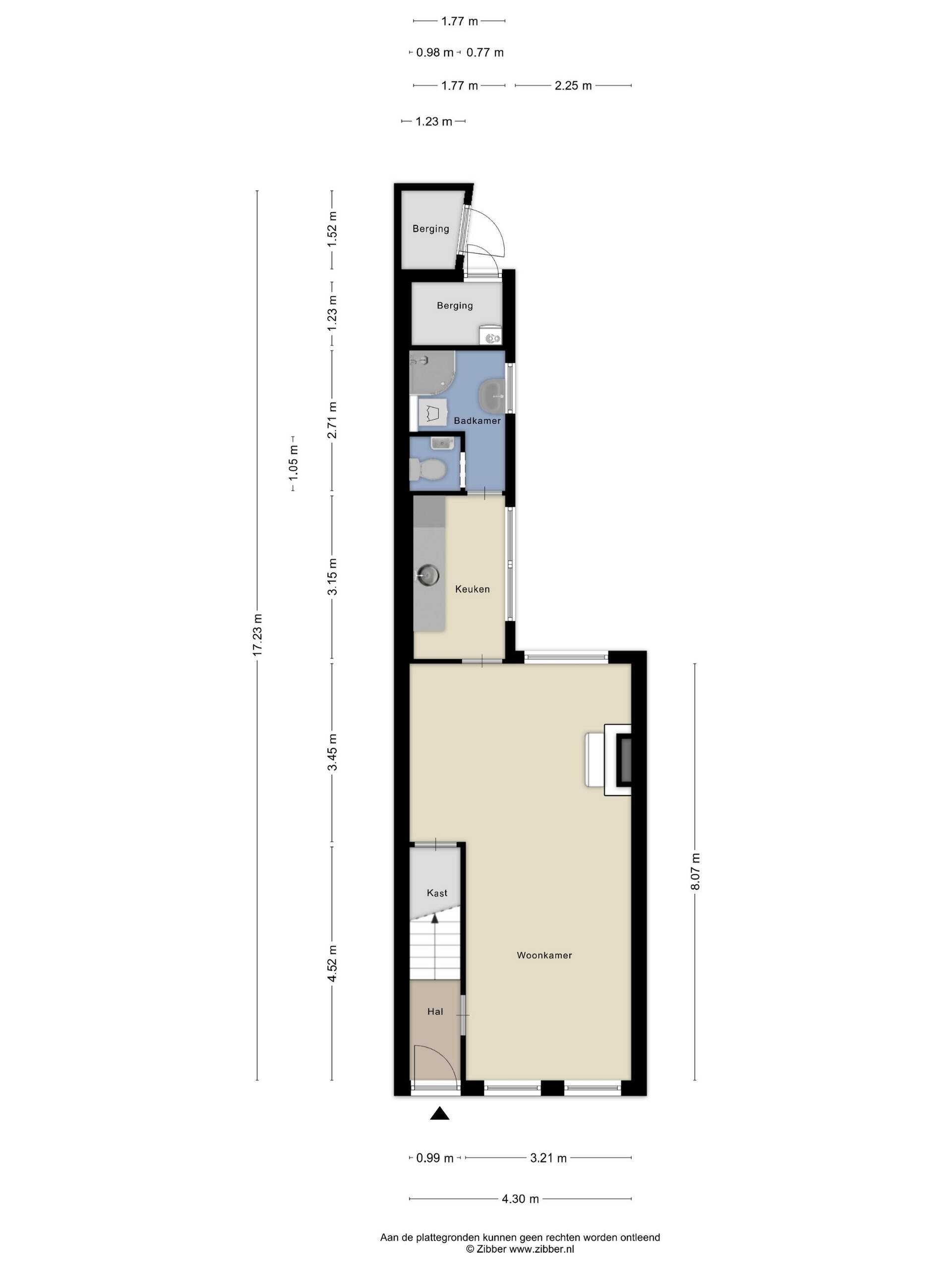Entree via de hal met trapopgang en bergruimte. Vanuit de hal bereik je de lichte woonkamer aan de voorzijde. Aan de achterzijde bevindt zich de keuken met aansluitend de badkamer en het toilet. Vanuit de keuken heb je toegang tot de diepe achtertuin.