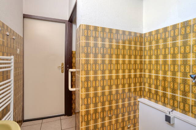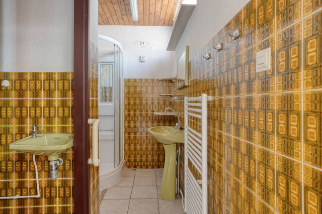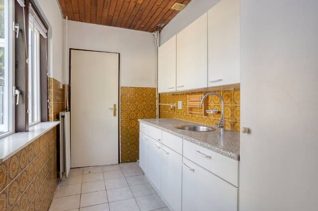 At the rear of the house, you will find the kitchen, with the bathroom and a separate toilet adjacent. The current finish is dated, but this offers an excellent opportunity to modernize the entire space and redesign it according to your own preferences.