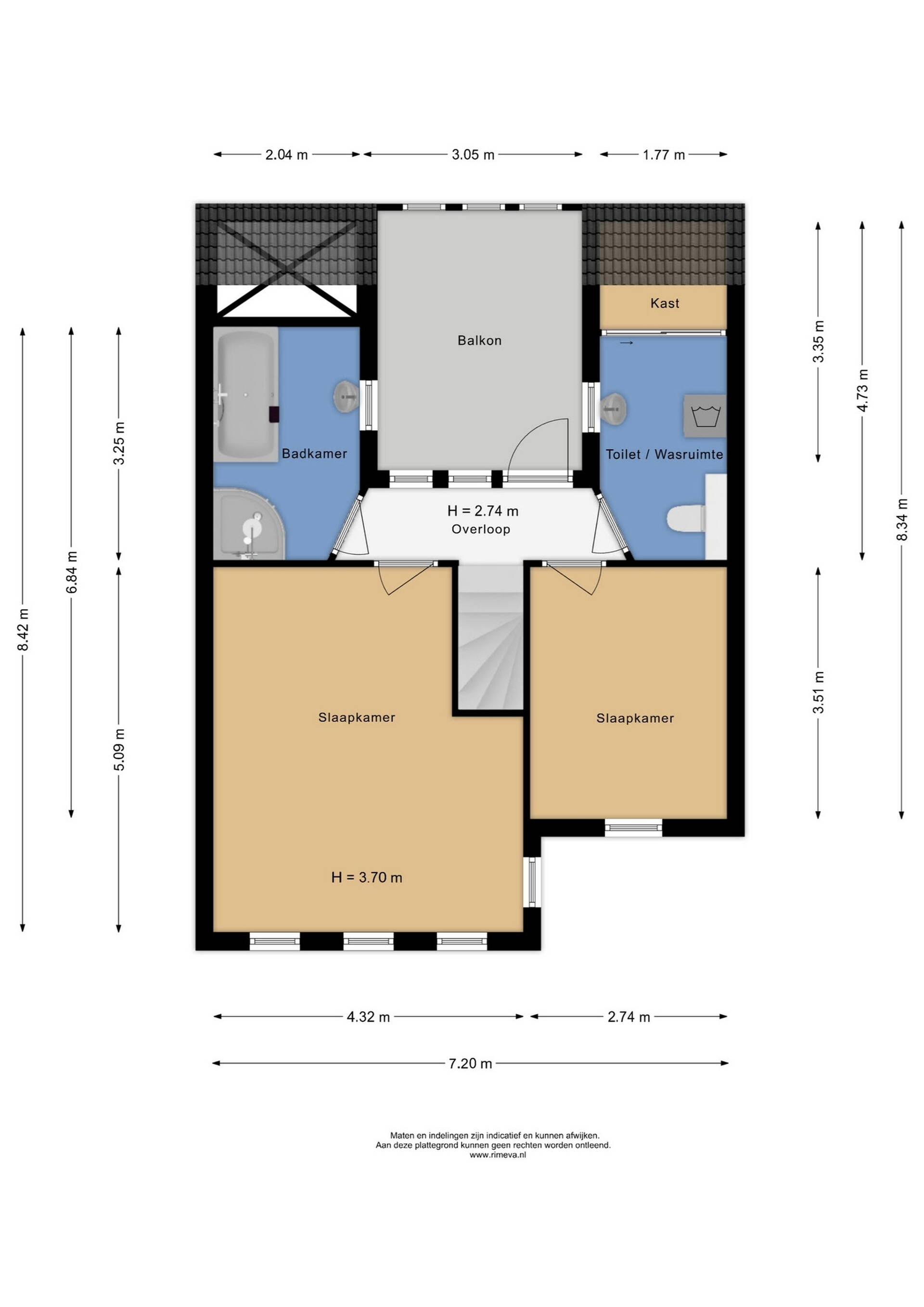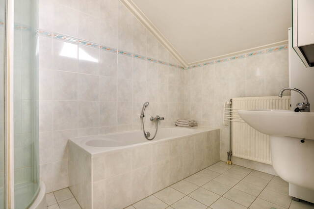 Overloop met toegang tot de tweede en derde slaapkamer. De badkamer is voorzien van een ligbad,