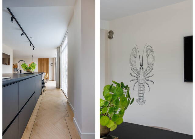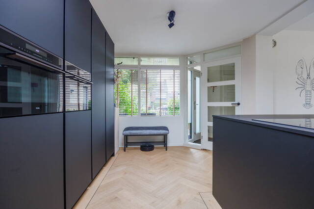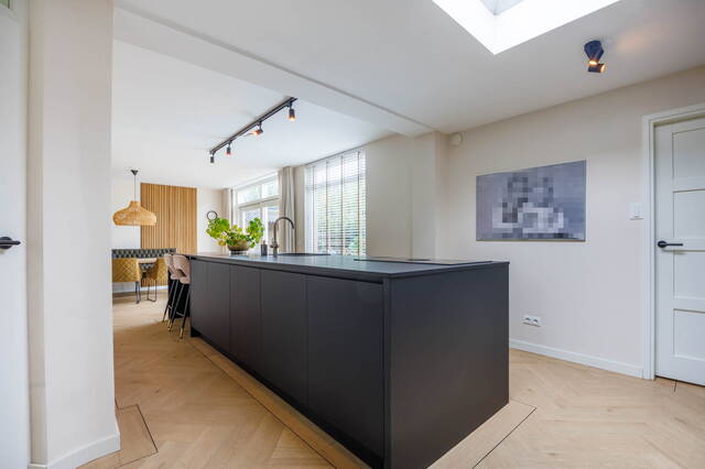 Keuken: de luxe open keuken is het hart van het huis. Uitgevoerd met een groot kookeiland, strakke matzwarte kastenwand met inbouwapparatuur (o.a. oven en combi-oven, een Quooker en een inductiekookplaat met ingebouwde afzuiging), en veel bergruimte. Dankzij de grote ramen en lichtkoepel is het een bijzonder lichte leefruimte.