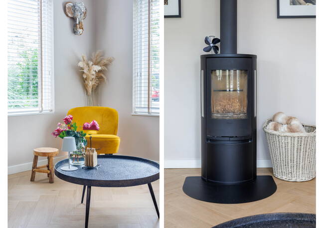 Woonkamer: een royale, lichte woonkamer met een sfeervolle houtkachel, grote raampartijen en uitzicht op de tuin. De pvc-visgraatvloer met vloerverwarming loopt door over de gehele verdieping en geeft een warme uitstraling.