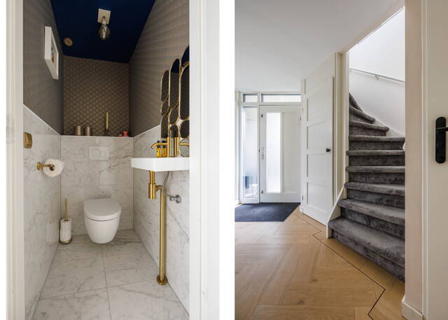 Voortuin & entree: een verzorgd aangelegde voortuin leidt u naar de entree met overkapping. Hier vindt u de ruime hal met garderobe, meterkast, trapkast en een modern toilet met fonteintje.
