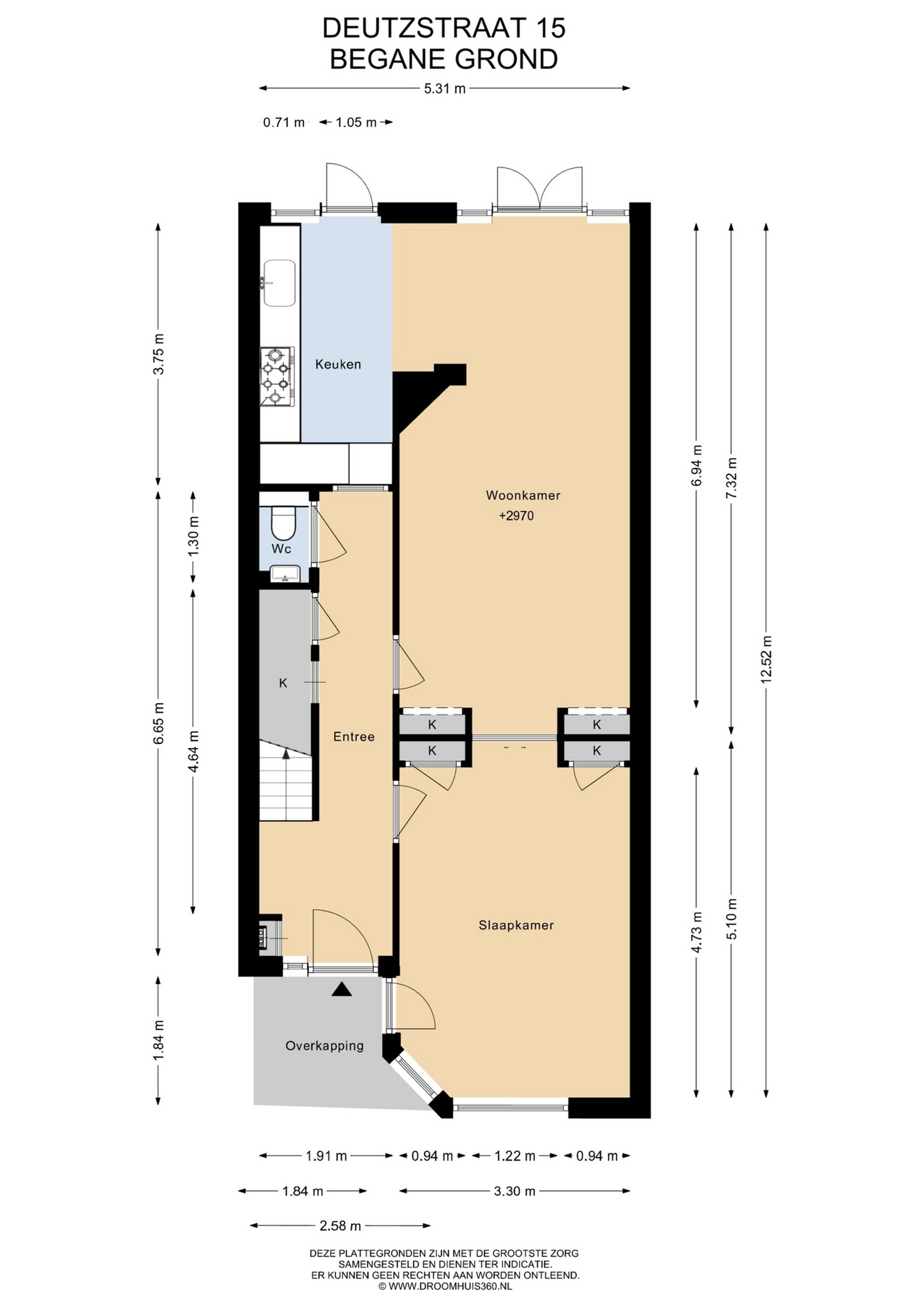 Via de ruime voortuin met veel privacy, komt u bij de woning. Entree met meterkast, garderobe en lange gang met trap naar de verdieping, trapkast, toilet met fonteintje en toegang tot de woonkamer. De zeer lichte en erg ruime woonkamer en suite is maar liefst 12,50 meter lang met een ca 3 meter hoog plafond. Dankzij de en suite met schuifdeuren en aan weerzijde vast kasten is de woonkamer in te delen als 2 aparte kamers. De woonkamer is voorzien van een mooie houten vloer, glad gestuukte wanden en heeft openslaande deuren naar de zonnige achtertuin. Er is een brede doorloop naar de moderne keuken met luxe inrichting en fraai antraciet werkblad. De moderne keuken is voorzien van alle benodigde (inbouw)apparatuur zoals een vaatwasser, combi-oven, koel-vries combinatie en een 5-pits-gaskookplaat met rvs-afzuigkap.